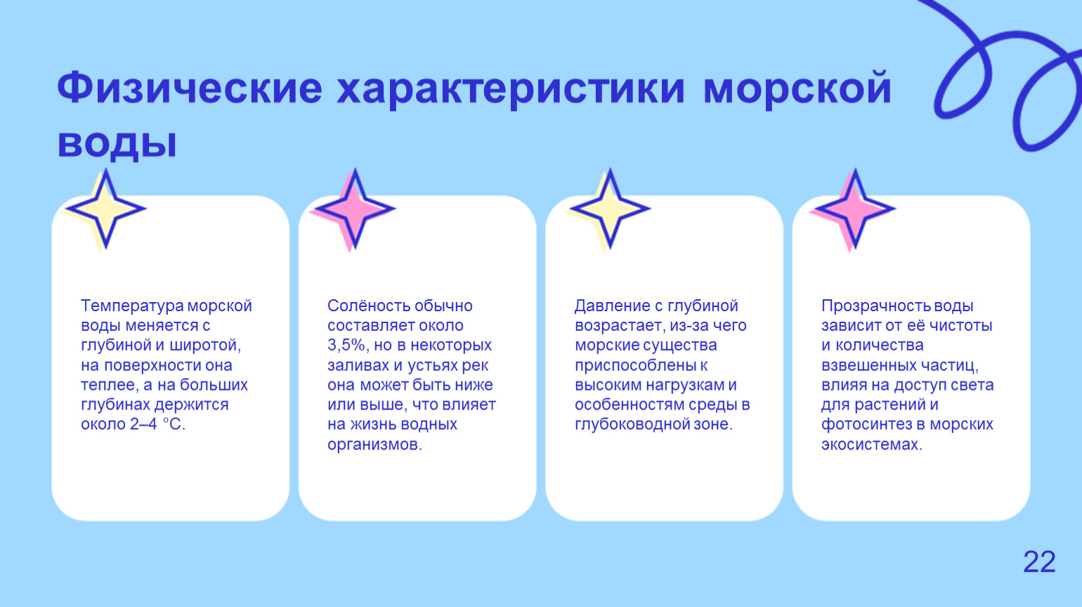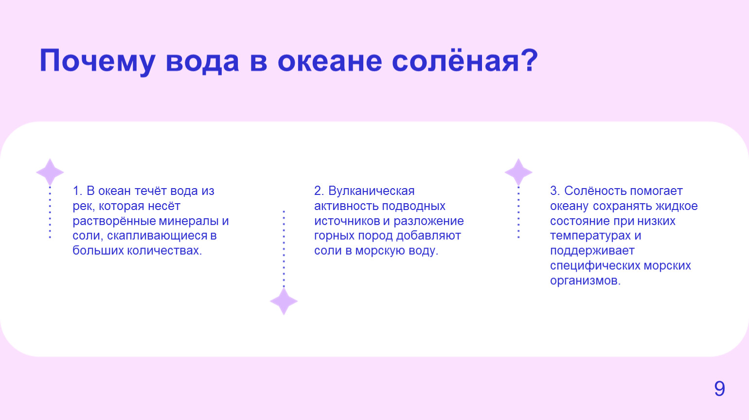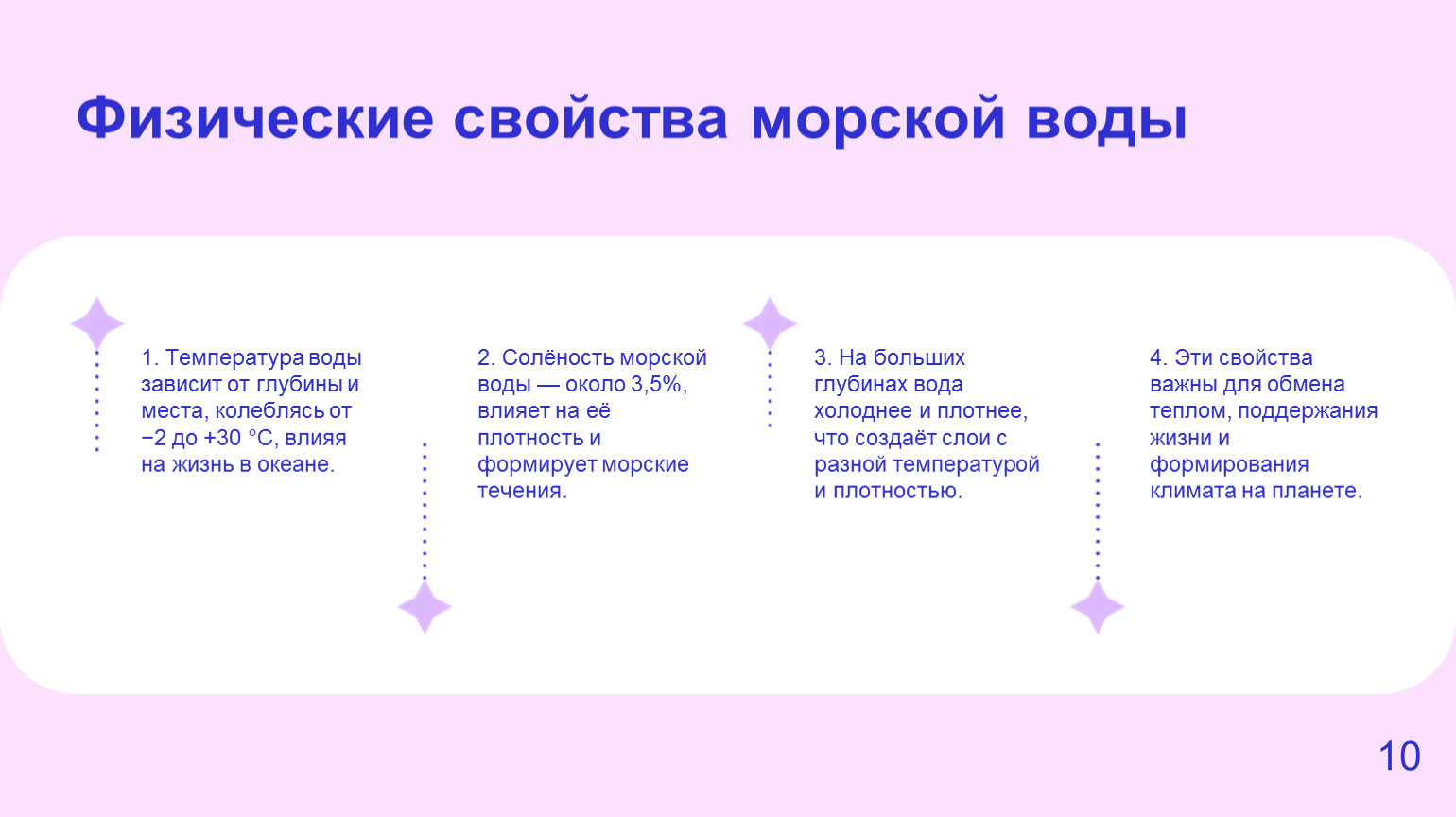 2. Солёность морской воды — около 3,5%, влияет на её плотность и формирует морские течения.