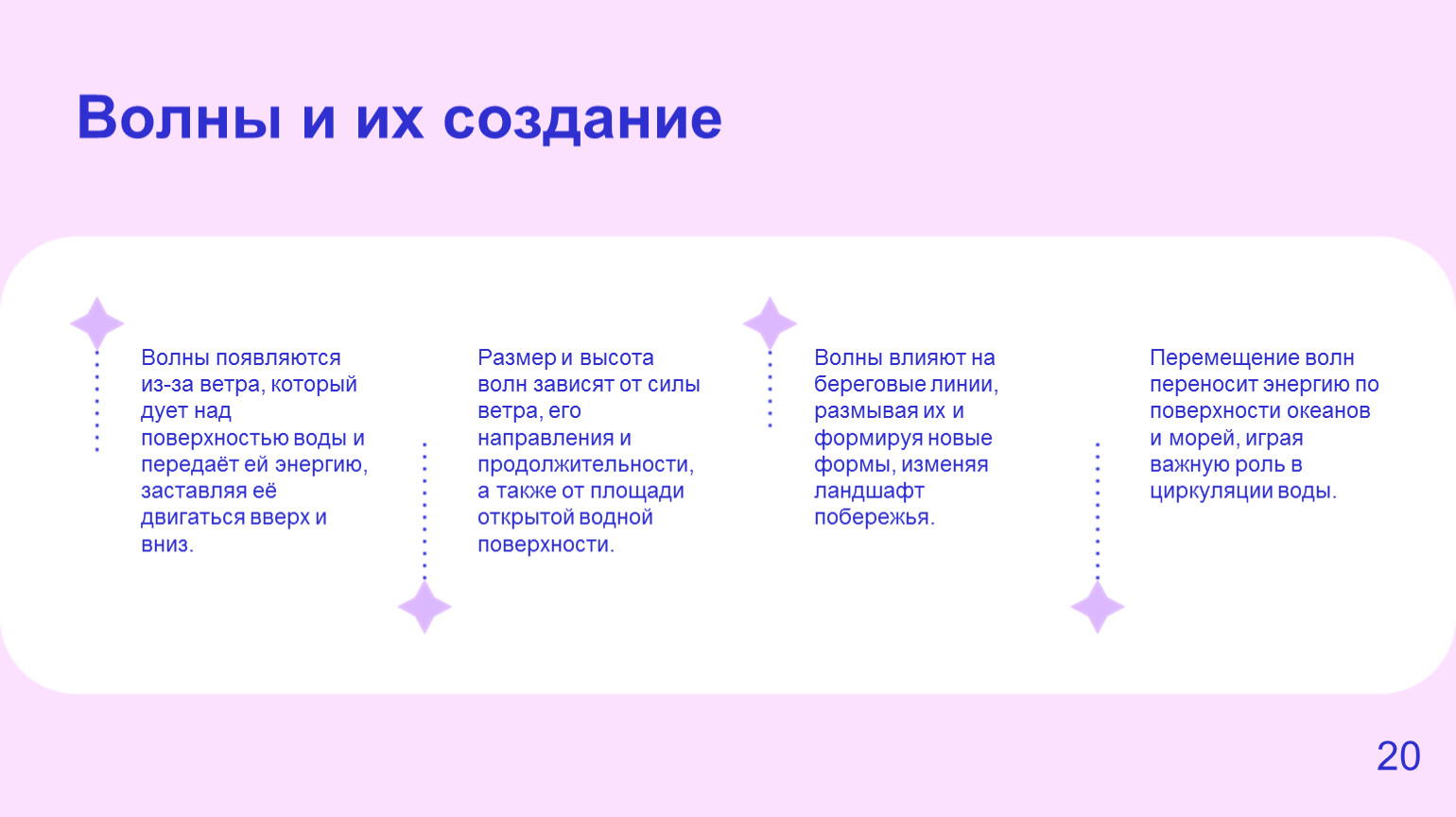 Волны появляются из-за ветра, который дует над поверхностью воды и передаёт ей энергию, заставляя её двигаться вверх и вниз.