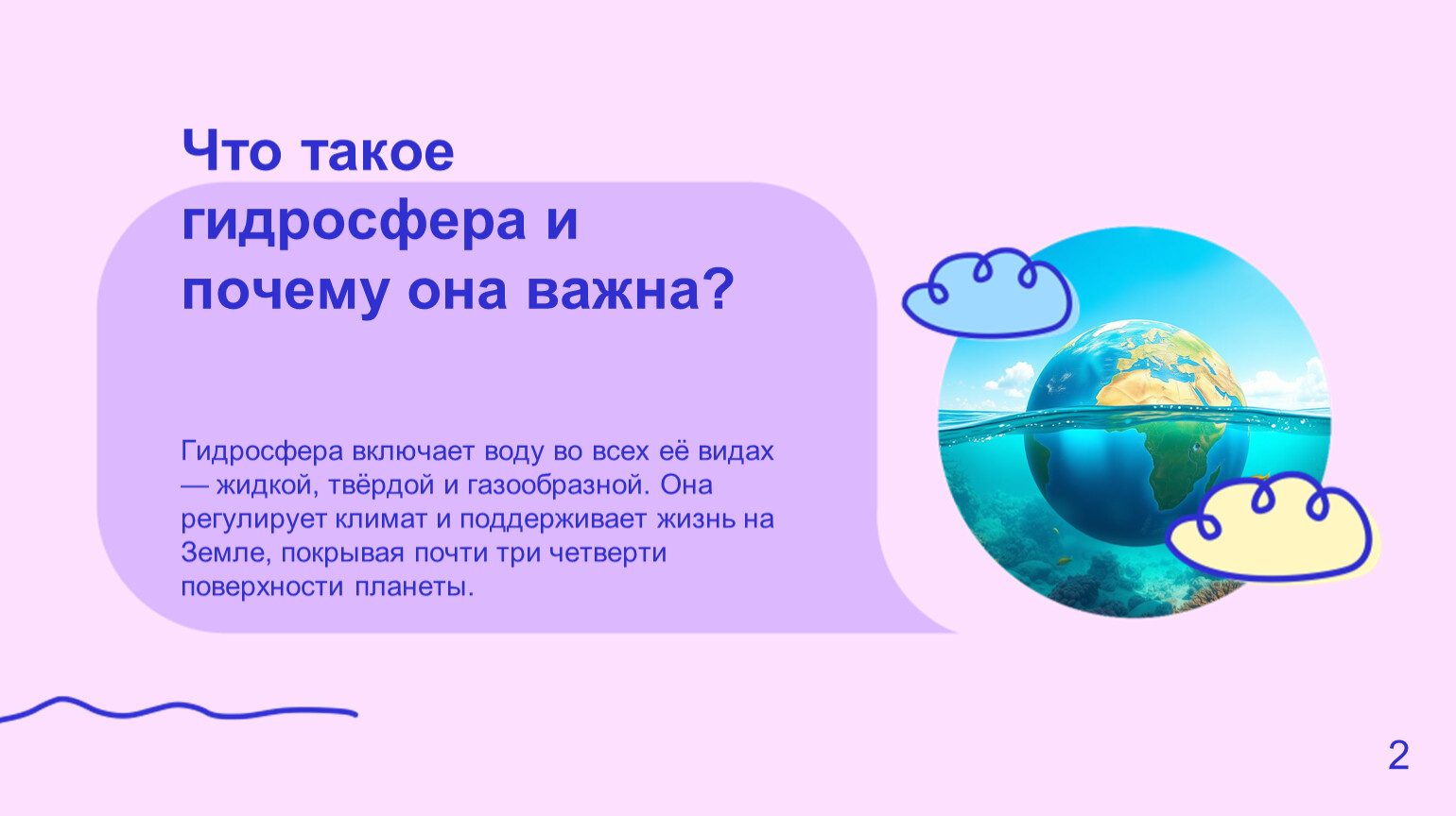 Гидросфера — вся вода Земли, важная для жизни и природы.