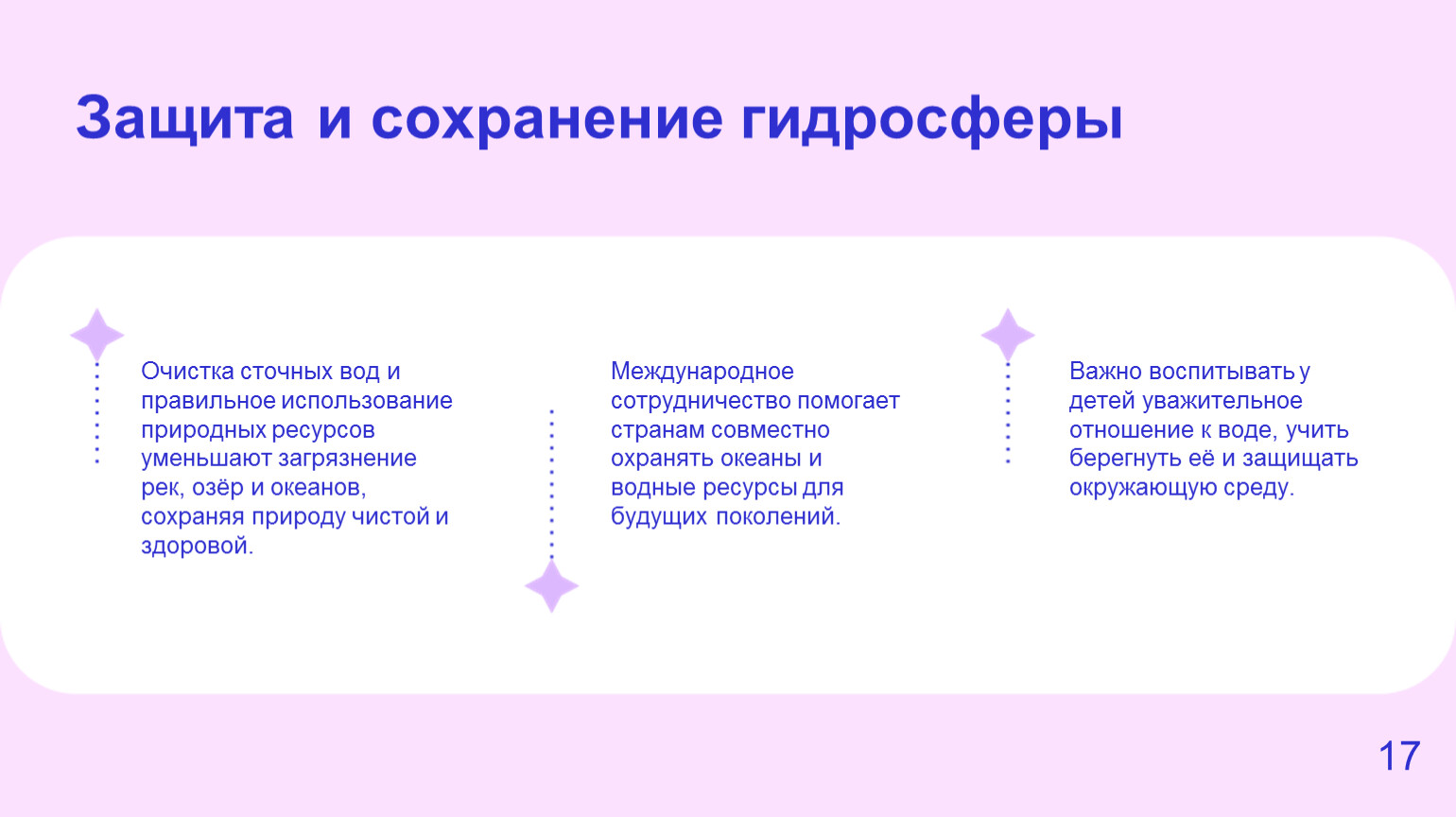 Очистка сточных вод и правильное использование природных ресурсов уменьшают загрязнение рек, озёр и океанов, сохраняя природу чистой и здоровой.