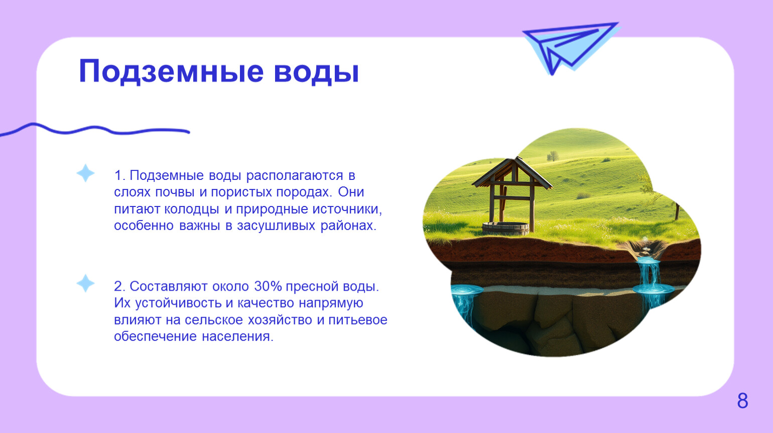 1. Подземные воды располагаются в слоях почвы и пористых породах. Они питают колодцы и природные источники, особенно важны в засушливых районах.