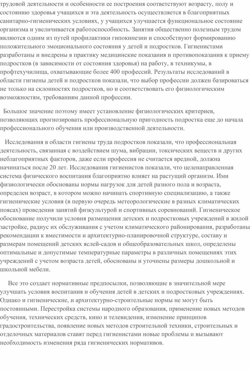 Исследования в области гигиены труда подростков показали, что профессиональная деятельность, связанная с воздействием шума, вибрации, токсических веществ и других неблагоприятных факторов, даже если профессия не считается вредной, должна начинаться после 20 лет. Исследования гигиенистов показали, что целенаправленная система физического воспитания благоприятно влияет на растущий организм. Ими физиологически обоснованы нормы нагрузок для детей разного пола и возраста, определен возраст, в котором можно начинать спортивную специализацию, а также гигиенические условия (в первую очередь метеорологические в разных климатических поясах) проведения занятий физкультурой и спортивных соревнований. Гигиеническое обоснование получили условия размещения детских и подростковых учреждений в жилой застройке, радиус их обслуживания с учетом климатического районирования, разработаны рекомендации к вместимости и архитектурно-планировочной структуре, составу и размерам помещений детских яслей-садов и общеобразовательных школ, определены оптимальные и допустимые температурные параметры в различных помещениях этих учреждений с учетом возраста детей, обоснованы и уточнены размеры дошкольной и школьной мебели.