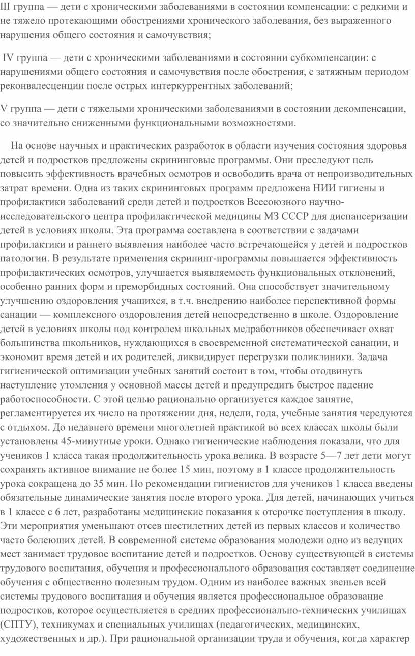 На основе научных и практических разработок в области изучения состояния здоровья детей и подростков предложены скрининговые программы. Они преследуют цель повысить эффективность врачебных осмотров и освободить врача от непроизводительных затрат времени. Одна из таких скрининговых программ предложена НИИ гигиены и профилактики заболеваний среди детей и подростков Всесоюзного научно-исследовательского центра профилактической медицины МЗ СССР для диспансеризации детей в условиях школы. Эта программа составлена в соответствии с задачами профилактики и раннего выявления наиболее часто встречающейся у детей и подростков патологии. В результате применения скрининг-программы повышается эффективность профилактических осмотров, улучшается выявляемость функциональных отклонений, особенно ранних форм и преморбидных состояний. Она способствует значительному улучшению оздоровления учащихся, в т.ч. внедрению наиболее перспективной формы санации — комплексного оздоровления детей непосредственно в школе. Оздоровление детей в условиях школы под контролем школьных медработников обеспечивает охват большинства школьников, нуждающихся в своевременной систематической санации, и экономит время детей и их родителей, ликвидирует перегрузки поликлиники. Задача гигиенической оптимизации учебных занятий состоит в том, чтобы отодвинуть наступление утомления у основной массы детей и предупредить быстрое падение работоспособности. С этой целью рационально организуется каждое занятие, регламентируется их число на протяжении дня, недели, года, учебные занятия чередуются с отдыхом. До недавнего времени многолетней практикой во всех классах школы были установлены 45-минутные уроки. Однако гигиенические наблюдения показали, что для учеников 1 класса такая продолжительность урока велика. В возрасте 5—7 лет дети могут сохранять активное внимание не более 15 мин, поэтому в 1 классе продолжительность урока сокращена до 35 мин. По рекомендации гигиенистов для учеников 1 класса введены обязательные динамические занятия после второго урока. Для детей, начинающих учиться в 1 классе с 6 лет, разработаны медицинские показания к отсрочке поступления в школу. Эти мероприятия уменьшают отсев шестилетних детей из первых классов и количество часто болеющих детей. В современной системе образования молодежи одно из ведущих мест занимает трудовое воспитание детей и подростков. Основу существующей в системы трудового воспитания, обучения и профессионального образования составляет соединение обучения с общественно полезным трудом. Одним из наиболее важных звеньев всей системы трудового воспитания и обучения является профессиональное образование подростков, которое осуществляется в средних профессионально-технических училищах (СПТУ), техникумах и специальных училищах (педагогических, медицинских, художественных и др.). При рациональной организации труда и обучения, когда характер трудовой деятельности и особенности ее построения соответствуют возрасту, полу и состоянию здоровья учащихся и эта деятельность осуществляется в благоприятных санитарно-гигиенических условиях, у учащихся улучшается функциональное состояние организма и увеличивается работоспособность. Занятия общественно полезным трудом являются одним из путей профил