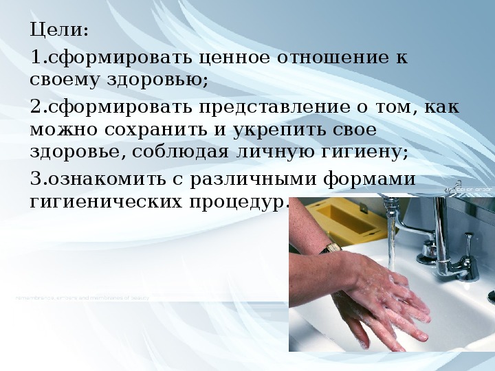 ознакомить с различными формами гигиенических процедур.Здоровье – состояние полного физического, психического и социального благополучия, а не только отсутствие болезни.
