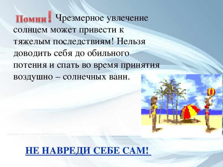 Воздушные ванныДозированная физическая нагрузкаВодные процедурыСолнечные ванны