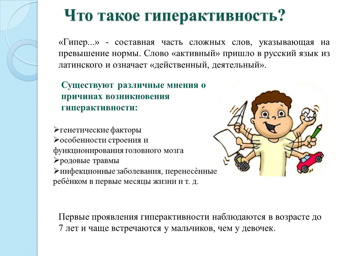 Первые проявления гиперактивности наблюдаются в возрасте до 7 лет и чаще встречаются у мальчиков, чем у девочек.