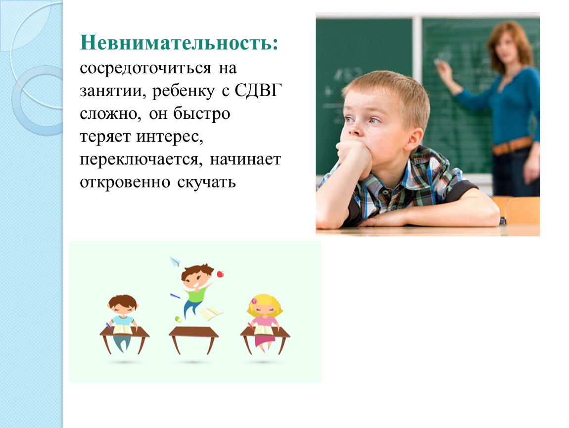Невнимательность: сосредоточиться на занятии, ребенку с СДВГ сложно, он быстро теряет интерес, переключается, начинает откровенно скучать