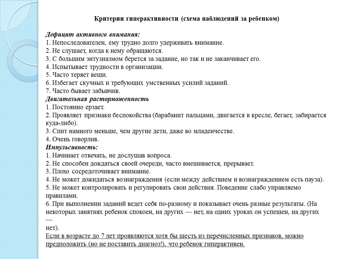 Критерии гиперактивности (схема наблюдений за ребенком)