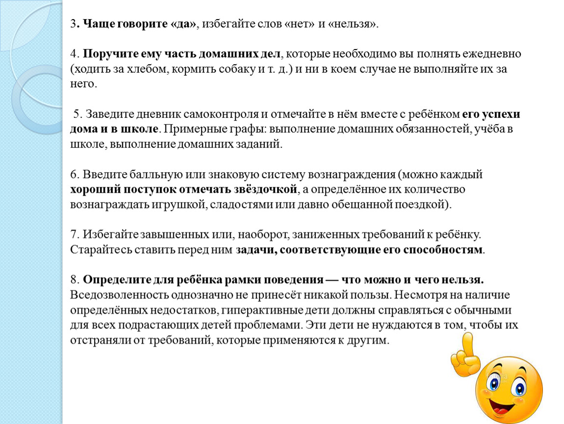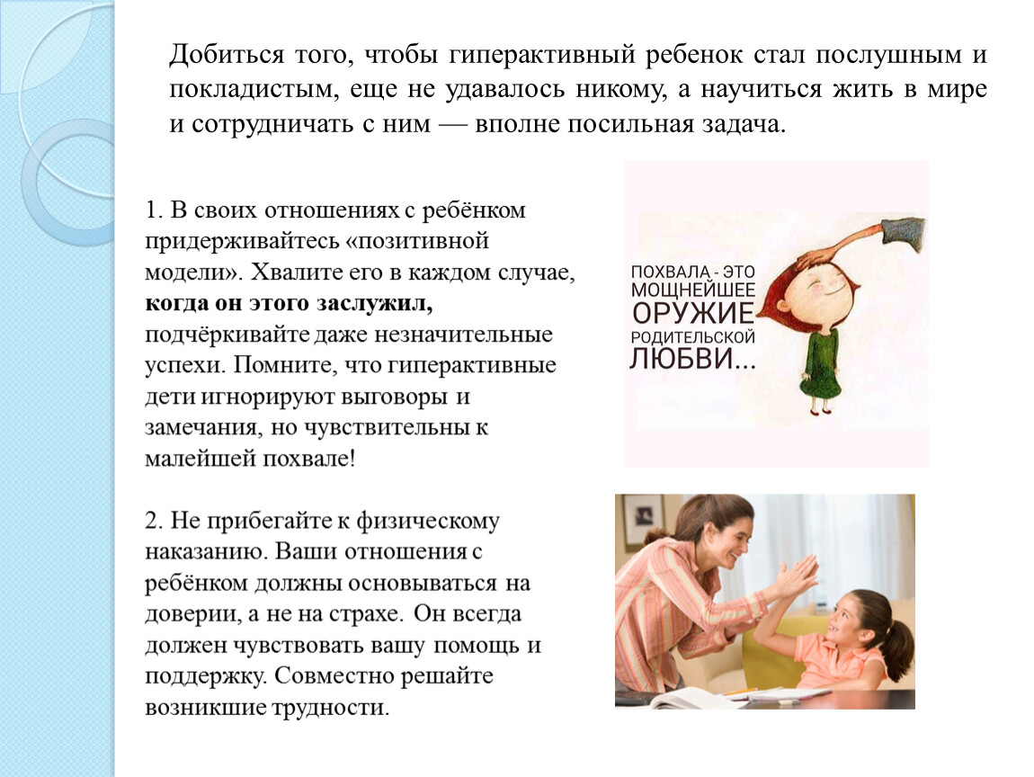 1. В своих отношениях с ребёнком придерживайтесь «позитивной модели». Хвалите его в каждом случае, когда он этого заслужил, подчёркивайте даже незначительные успехи. Помните, что гиперактивные дети игнорируют выговоры и замечания, но чувствительны к малейшей похвале!