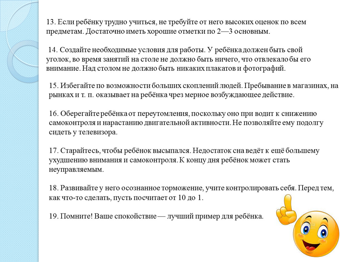 18. Развивайте у него осознанное торможение, учите контролировать себя. Перед тем, как что-то сделать, пусть посчитает от 10 до 1.