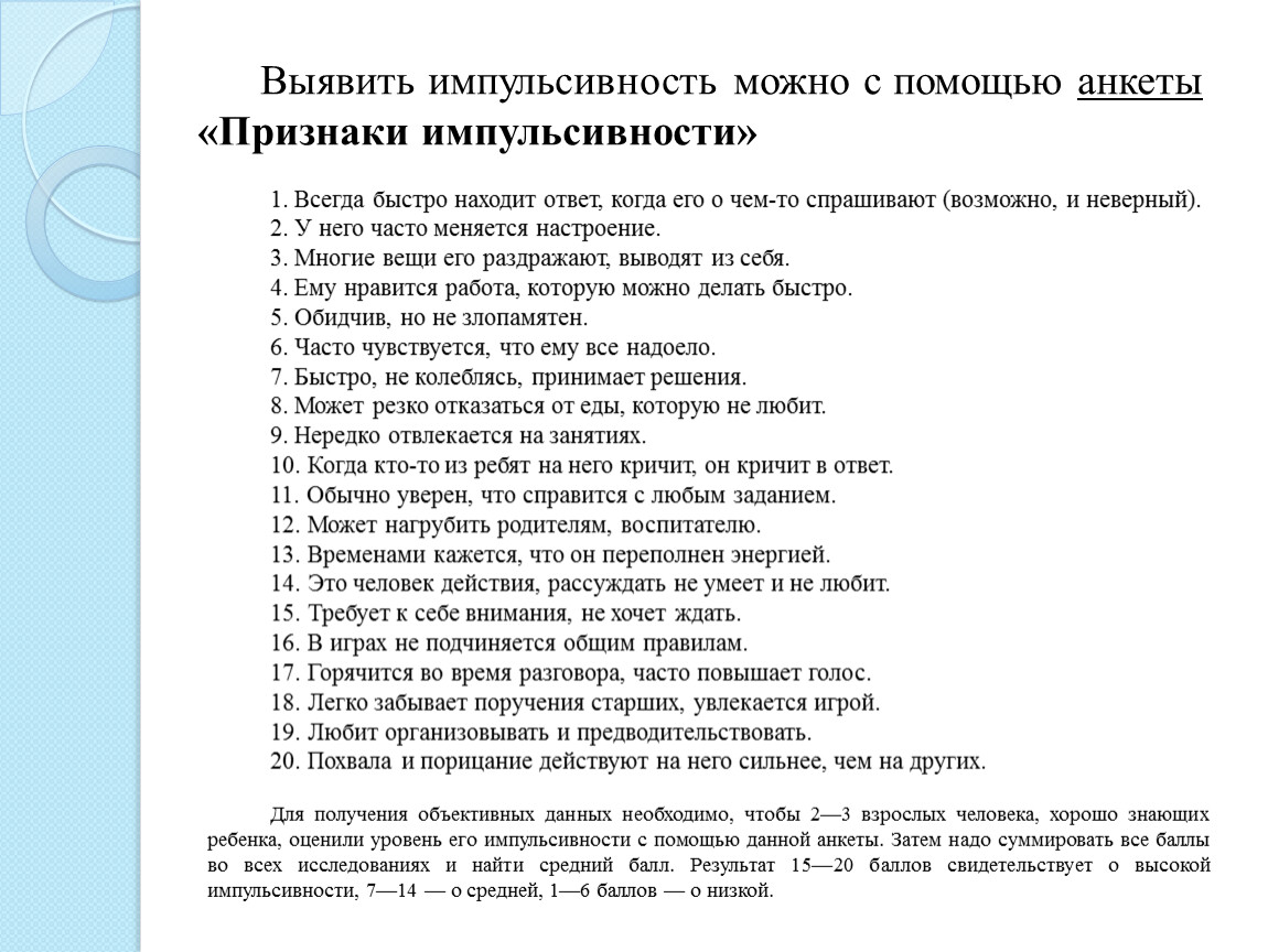 Выявить импульсивность можно с помощью анкеты «Признаки импульсивности»