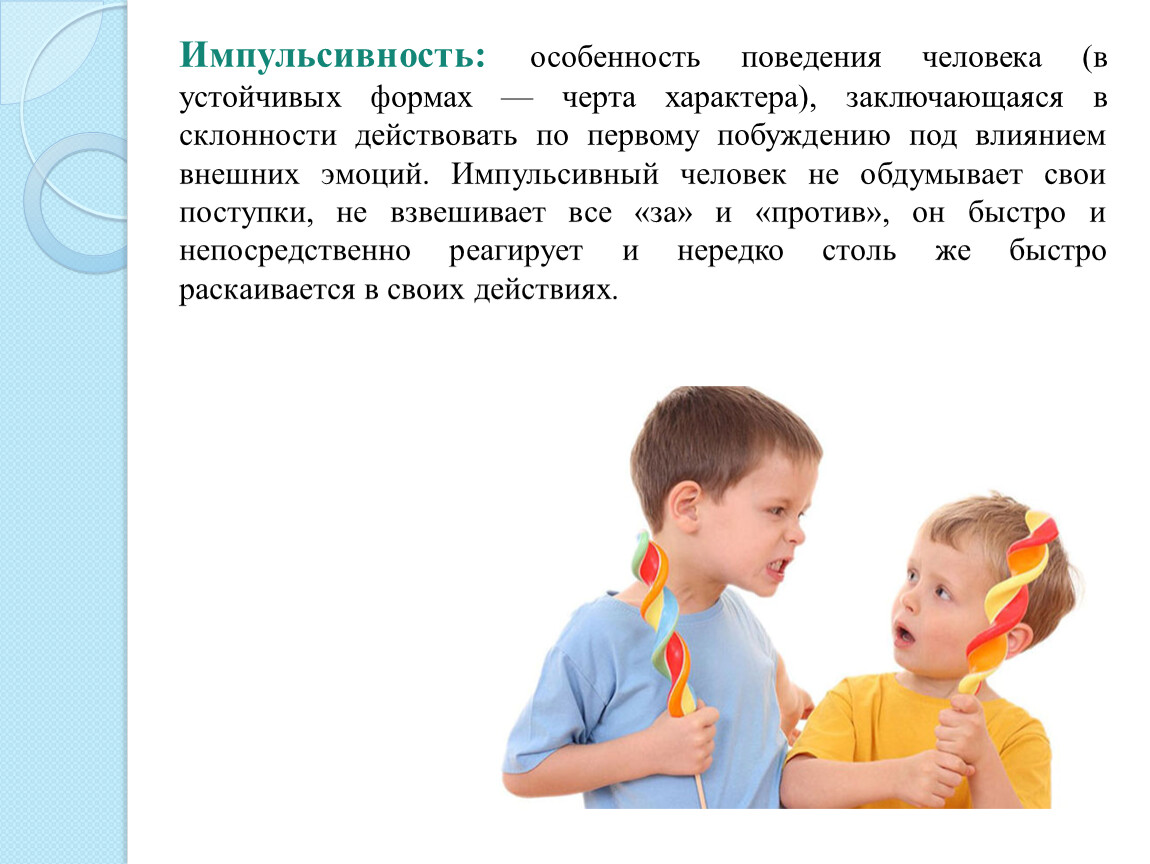 Импульсивность: особенность поведения человека (в устойчивых формах — черта характера), заключающаяся в склонности действовать по первому побуждению под влиянием внешних эмоций. Импульсивный человек не обдумывает свои поступки, не взвешивает все «за» и «против», он быстро и непосредственно реагирует и нередко столь же быстро раскаивается в своих действиях.