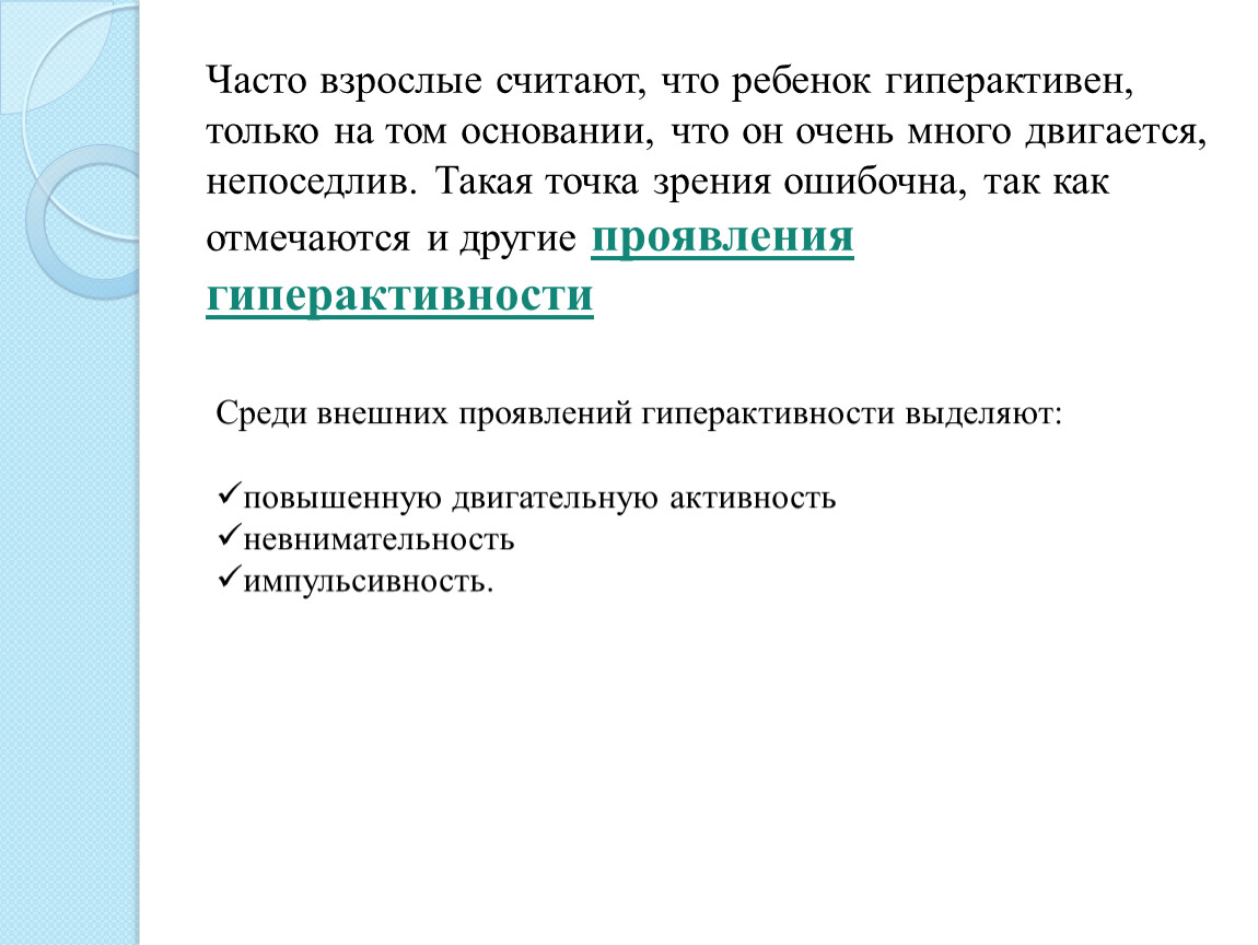 Часто взрослые считают, что ребенок гиперактивен, только на том основании, что он очень много двигается, непоседлив. Такая точка зрения ошибочна, так как отмечаются и другие проявления гиперактивности