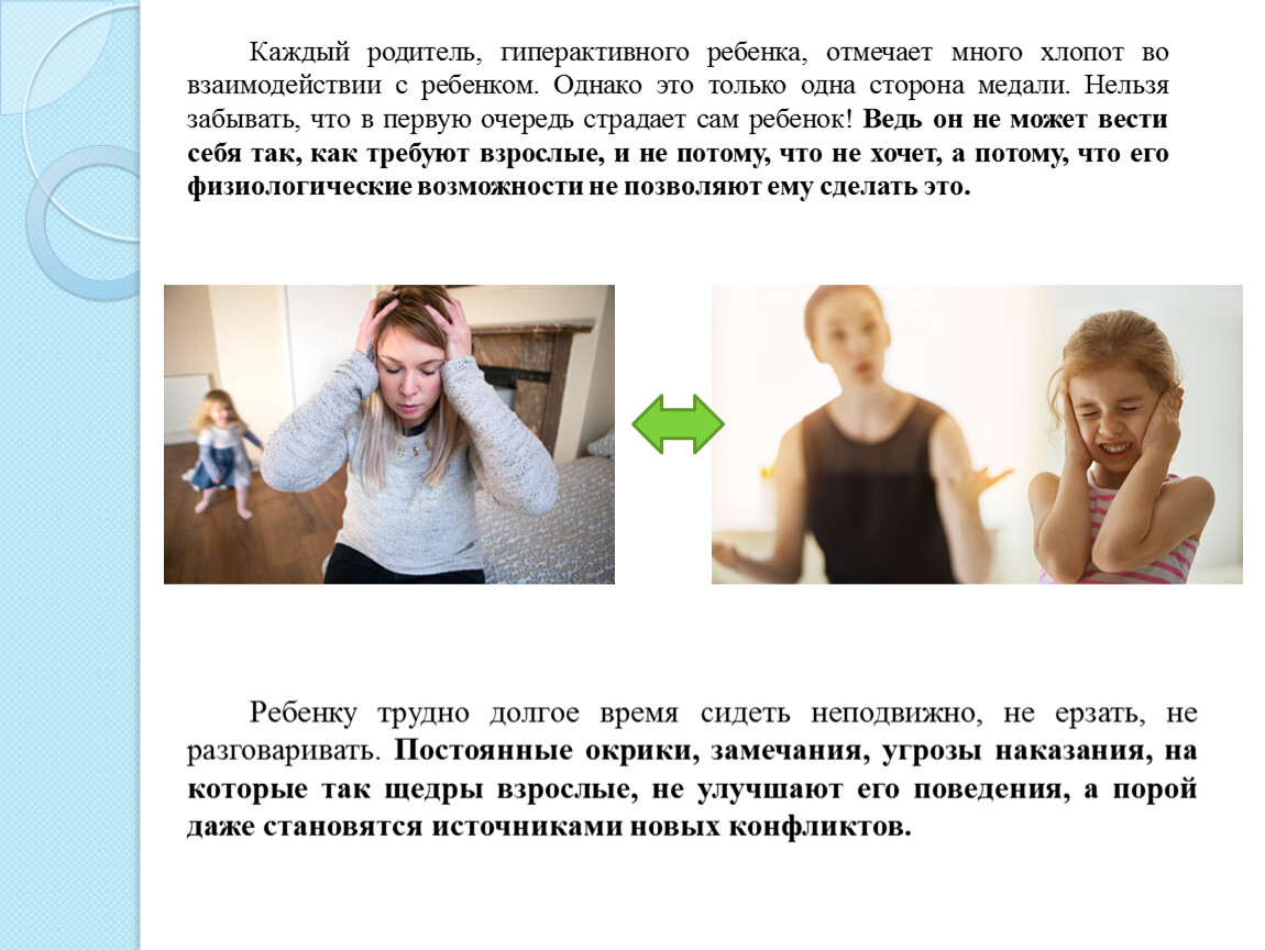 Каждый родитель, гиперактивного ребенка, отмечает много хлопот во взаимодействии с ребенком. Однако это только одна сторона медали. Нельзя забывать, что в первую очередь страдает сам ребенок! Ведь он не может вести себя так, как требуют взрослые, и не потому, что не хочет, а потому, что его физиологические возможности не позволяют ему сделать это.