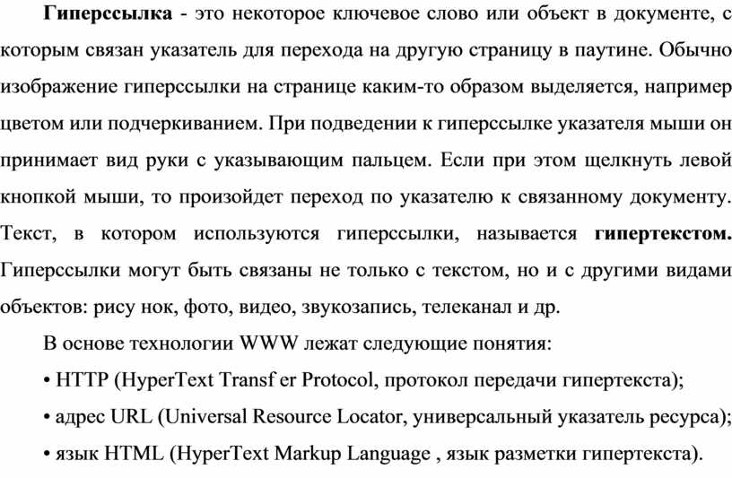 Гиперссылка - это некоторое ключевое слово или объект в документе, с которым связан указатель для перехода на другую страницу в паутине. Обычно изображение гиперссылки на странице каким-то образом выделяется, например цветом или подчеркиванием. При подведении к гиперссылке указателя мыши он принимает вид руки с указывающим пальцем. Если при этом щелкнуть левой кнопкой мыши, то произойдет переход по указателю к связанному документу. Текст, в котором используются гиперссылки, называется гипертекстом. Гиперссылки могут быть связаны не только с текстом, но и с другими видами объектов: рису нок, фото, видео, звукозапись, телеканал и др.