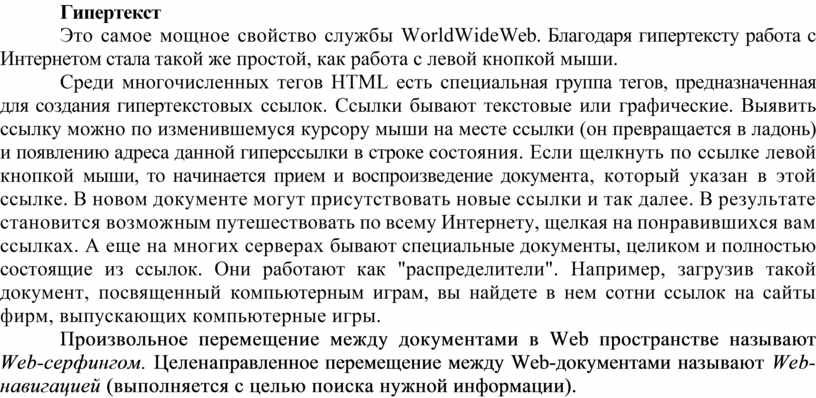 Это самое мощное свойство службы WorldWideWeb. Благодаря гипертексту работа с Интернетом стала такой же простой, как работа с левой кнопкой мыши.