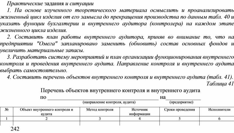 4. Составить перечень объектов внутреннего контроля и внутреннего аудита (табл. 41).