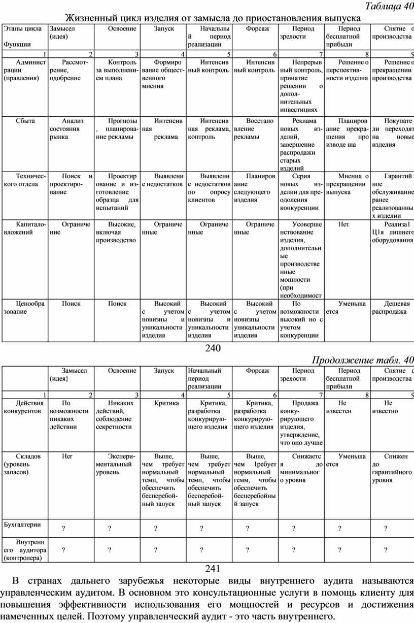 1. На основе изученного теоретического материала осмыслить и проанализировать жизненный цикл изделия от его замысла до прекращения производства по данным табл. 40 и указать функции бухгалтерии и внутреннего аудитора (контролера) на каждом этапе жизненного цикла изделия.