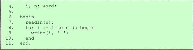Так как нам необходимо выводить натуральные числа, это означает, что вывод должен всегда начинаться с единицы, и при этом выводятся все следующие за ней натуральные числа до тех пор, пока значение переменной цикла (обычно используют переменную i) не достигнет конечного n (на последнем шаге значение переменной цикла будет равно n). После этого цикл завершится, и будут выполнены те операторы, которые следуют непосредственно за ним. Кстати, не стоит забывать, что после выхода из цикла for его переменная цикла считается неопределенной!