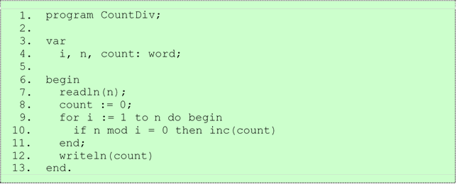 Решение. Задача достаточно похожа на две предыдущие. В ней также необходимо провести перебор в цикле некоторого количества натуральных чисел на предмет обнаружения делителей n, но при этом необходимо найти не первый из них с какого-либо конца отрезка [1, n] (это отрезок, содержащий все числа от 1 до n включительно), а посчитать их. Это можно сделать с помощью