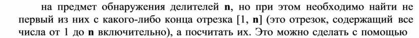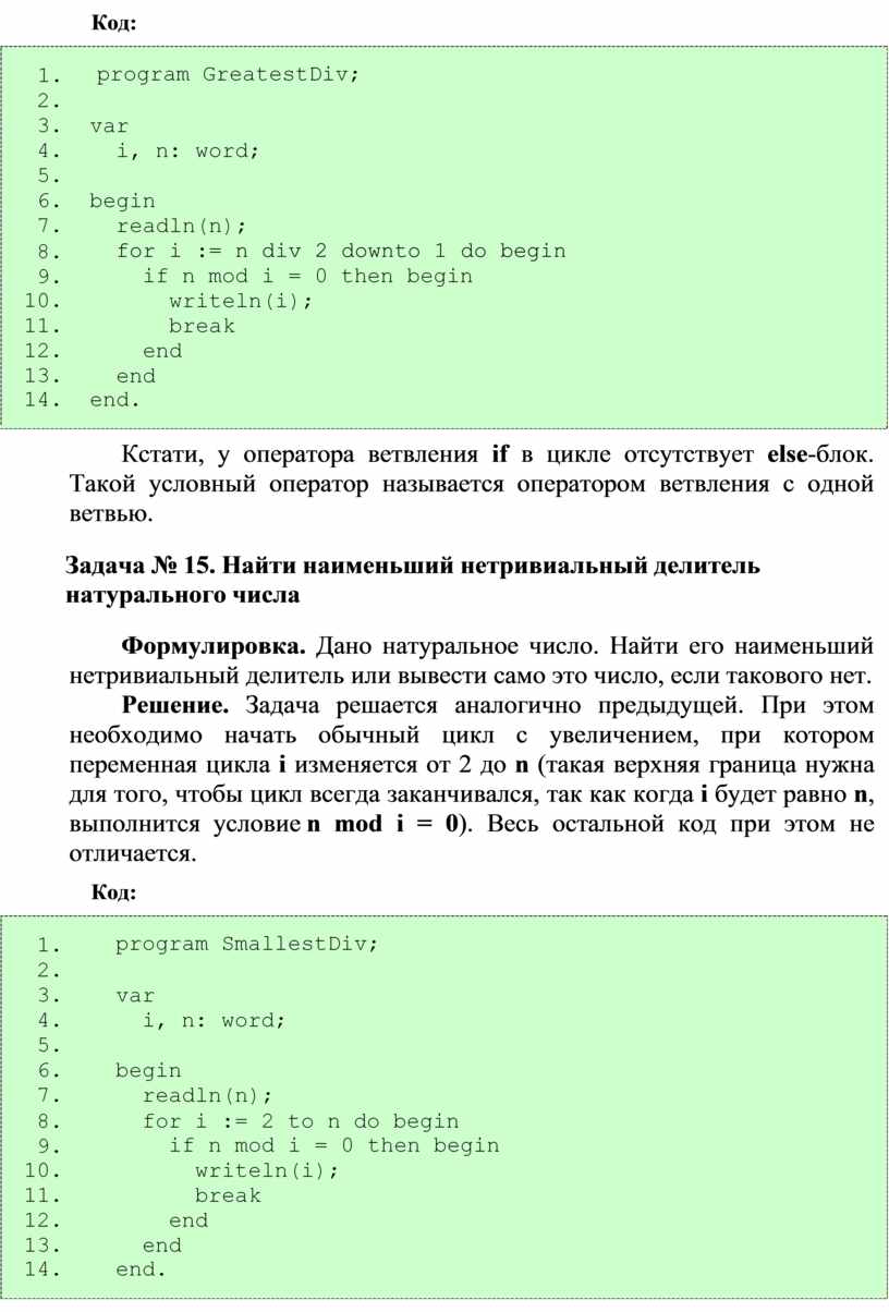 Хотя, если говорить точнее, следовало бы начать проверку с числа, равного n div 2 (чтобы отбросить дробную часть при делении, если n нечетно), так как ни одно натуральное число не имеет делителей больших, чем половина это этого числа. В противном случае частное от деления должно быть натуральным числом между 1 и 2, которого просто не существует.