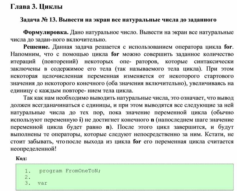 Решение. Данная задача решается с использованием оператора цикла for. Напомним, что с помощью цикла for можно совершить заданное количество итераций (повторений) некоторых опе- раторов, которые синтаксически заключены в содержимое его тела (так называемого тела цикла). При этом некоторая целочисленная переменная изменяется от некоторого стартового значения до некоторого конечного (оба значения включительно), увеличиваясь на единицу с каждым повторе- нием тела цикла.