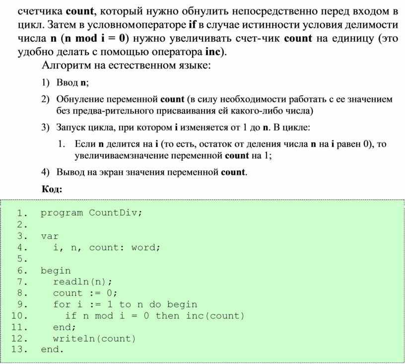 счетчика count, который нужно обнулить непосредственно перед входом в цикл. Затем в условном операторе if в случае истинности условия делимости числа n (n mod i = 0) нужно увеличивать счет- чик count на единицу (это удобно делать с помощью оператора inc).