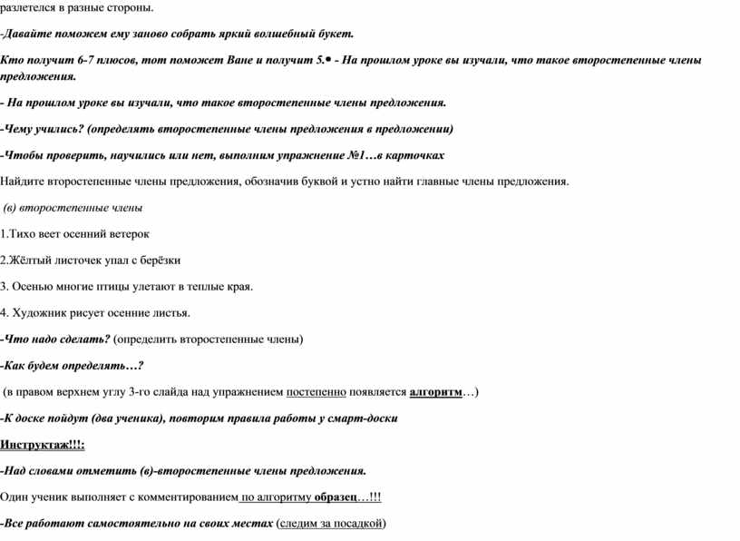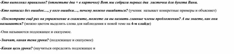 -Посмотрите на упражнение и подумайте, какое задание можно выполнить, чтобы научиться применять алгоритм?... Упражнение 2 Найдите главные члены и подчеркните их. 1. Осенью наступает золотая пора. 2. Осень шумит сухой листвой. 3.Ветер срывает листья с деревьев. 4. Осенью листья меняют цвета. 5. Мама гуляла по осеннему парку. -Выполнять нужно карандашом с линейкой, подчеркивая/ обозначая… (инструктаж!!!) -К доске пойдёт ученик под документ-камерой покажет образец с комментированием (учитель во время комментирования указкой ведет по алгоритму, можно для экономии времнени объединять несколько примеров) -Что скажем ученику у документ-камеры? Садись, поставь + -Работаем в парах… -Проводим самопроверку… с комментированием -Кто написал без ошибок…, у кого ошибки…, почему можно ошибиться? Поставьте + , вот мы почти собрали наш чудесный букет. |