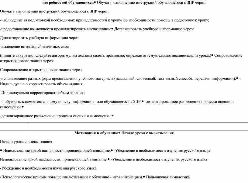 Обучать выполнению инструкций обучающегося с ЗПР через: -наблюдение за подготовкой необходимых принадлежностей к уроку/ по необходимости помощь в подготовке к уроку; -предоставление возможности проанализировать высказывание |
