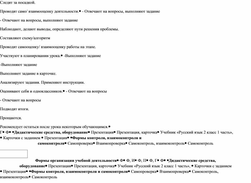 - Отвечают на вопросы, выполняют задание Наблюдают, делают выводы, определяют пути решения проблемы. Составляют схему/алгоритм Проводят самооценку/ взаимооценку работы на этапе. Участвуют в планировании урока. |