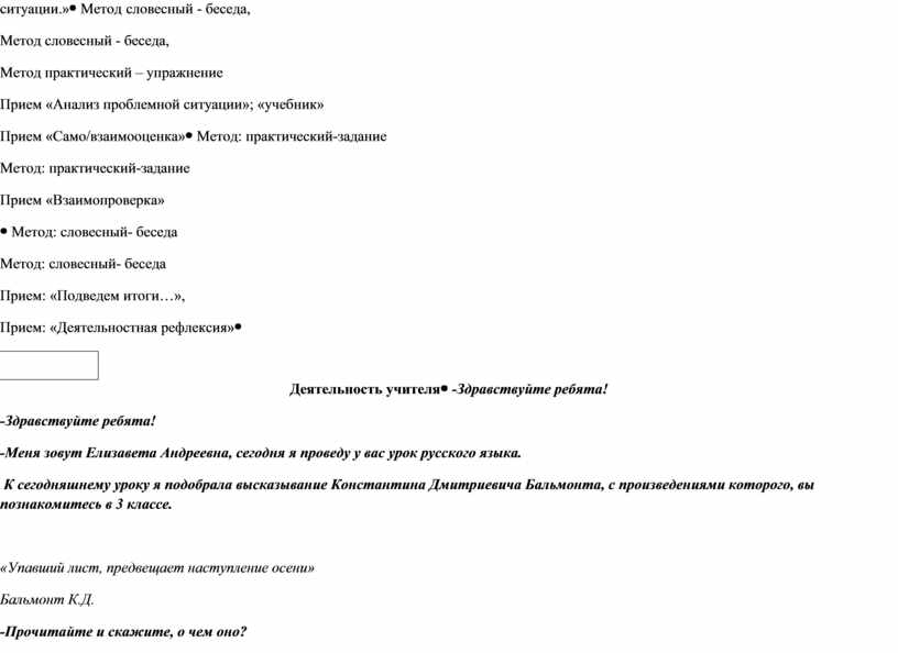 -Здравствуйте ребята! -Меня зовут Елизавета Андреевна, сегодня я проведу у вас урок русского языка. К сегодняшнему уроку я подобрала высказывание Константина Дмитриевича Бальмонта, с произведениями которого, вы познакомитесь в 3 классе.