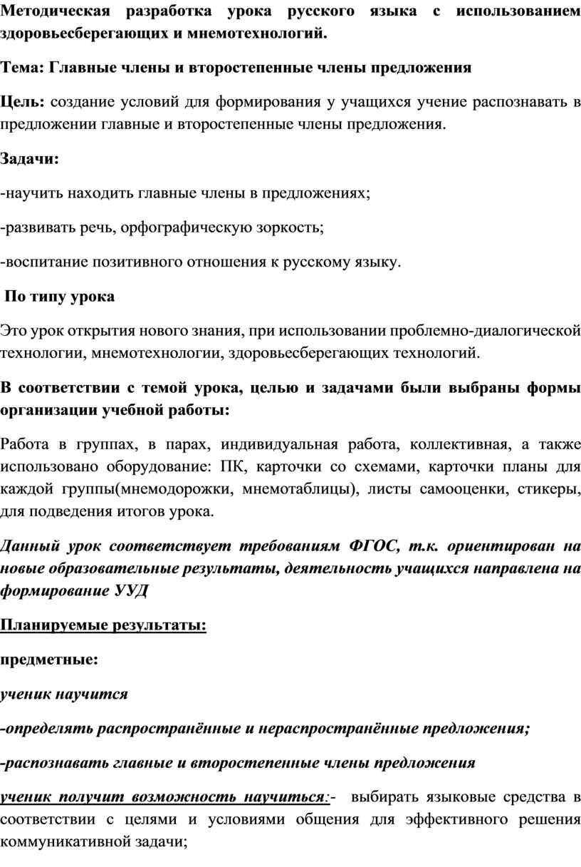 Методическая разработка урока русского языка с использованием здоровьесберегающих и мнемотехнологий.