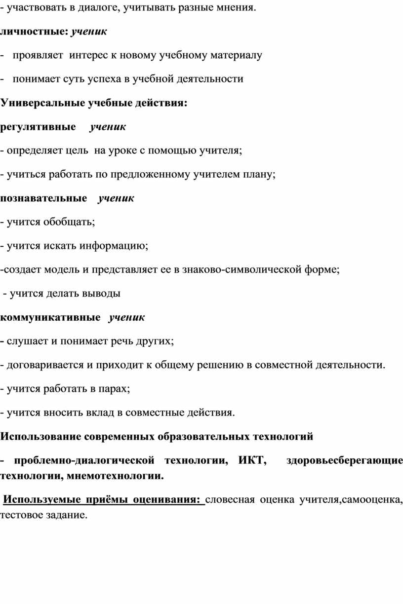 Используемые приёмы оценивания: словесная оценка учителя,самооценка, тестовое задание.