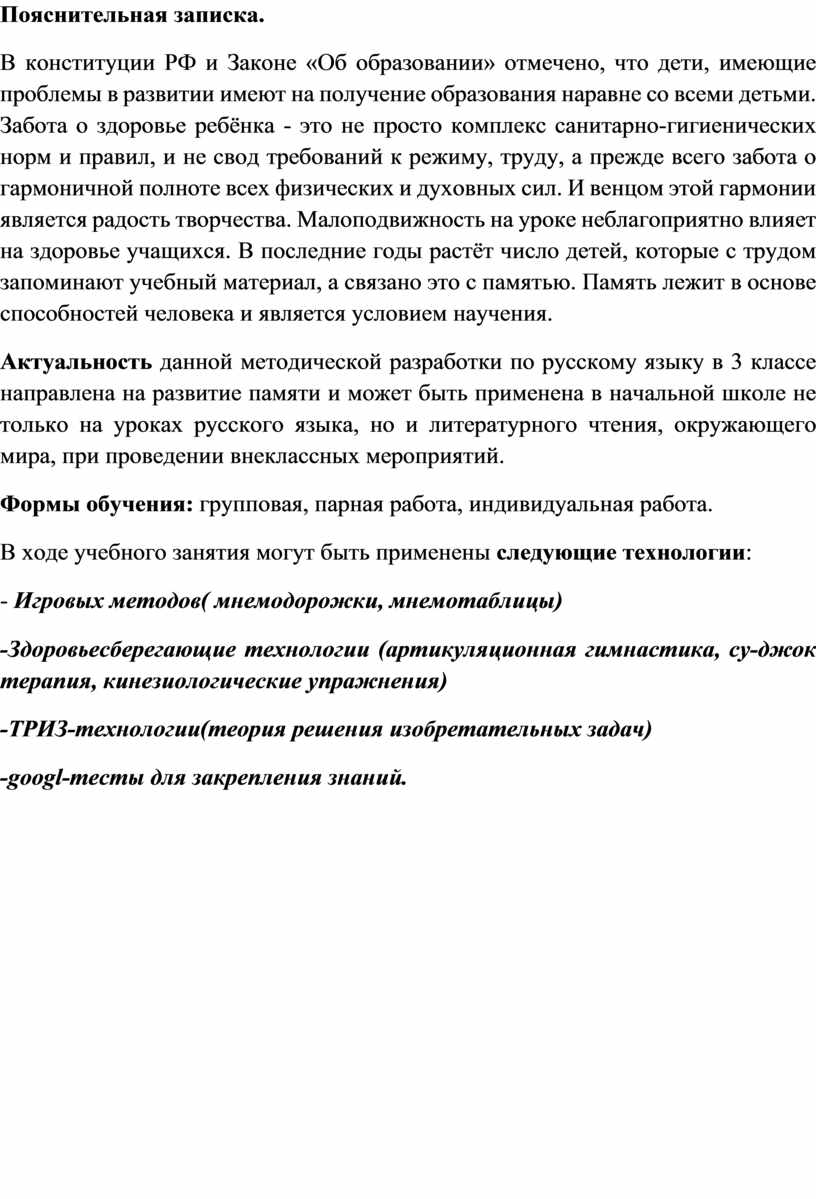 Актуальность данной методической разработки по русскому языку в 3 классе направлена на развитие памяти и может быть применена в начальной школе не только на уроках русского языка, но и литературного чтения, окружающего мира, при проведении внеклассных мероприятий.