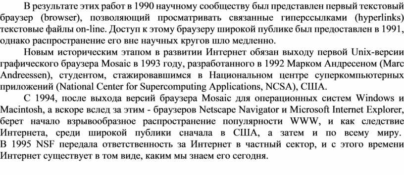В результате этих работ в 1990 научному сообществу был представлен первый текстовый браузер (browser), позволяющий просматривать связанные гиперссылками (hyperlinks) текстовые файлы on-line. Доступ к этому браузеру широкой публике был предоставлен в 1991, однако распространение его вне научных кругов шло медленно.