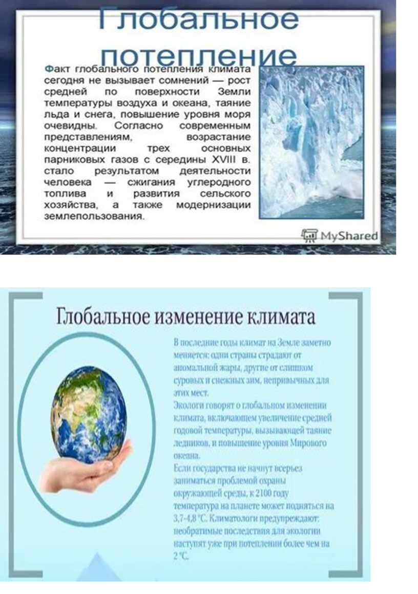 Глобальные изменения климата — это длительные и значительные изменения климатической системы Земли, выражающиеся в повышении средней температуры атмосферы и океанов, изменении осадков, частоты и интенсивности экстремальных погодных явлений. НапримерС 1850 года средняя температура на Земле неуклонно повышалась и выросла на 1,2 °C.