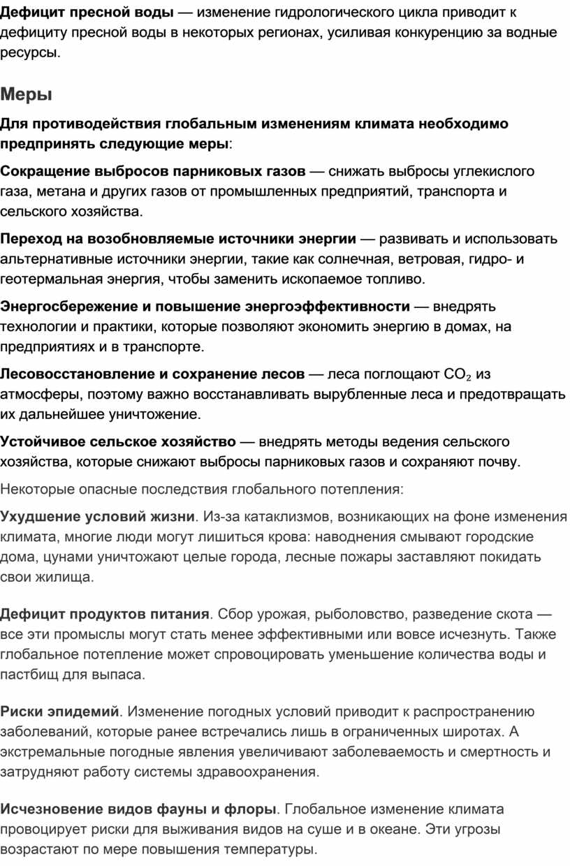 · Дефицит пресной воды — изменение гидрологического цикла приводит к дефициту пресной воды в некоторых регионах, усиливая конкуренцию за водные ресурсы.