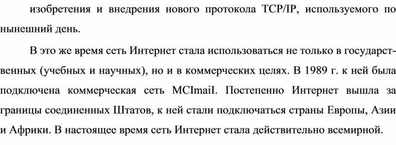 В это же время сеть Интернет стала использоваться не только в государственных (учебных и научных), но и в коммерческих целях. В 1989 г. к ней была подключена коммерческая сеть MCImaiI. Постепенно Интернет вышла за границы соединенных Штатов, к ней стали подключаться страны Европы, Азии и Африки. В настоящее время сеть Интернет стала действительно всемирной.