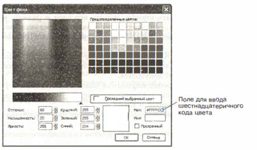 • вводом в поле Нех 16-ричного кода цвета (если он вам из вестен).