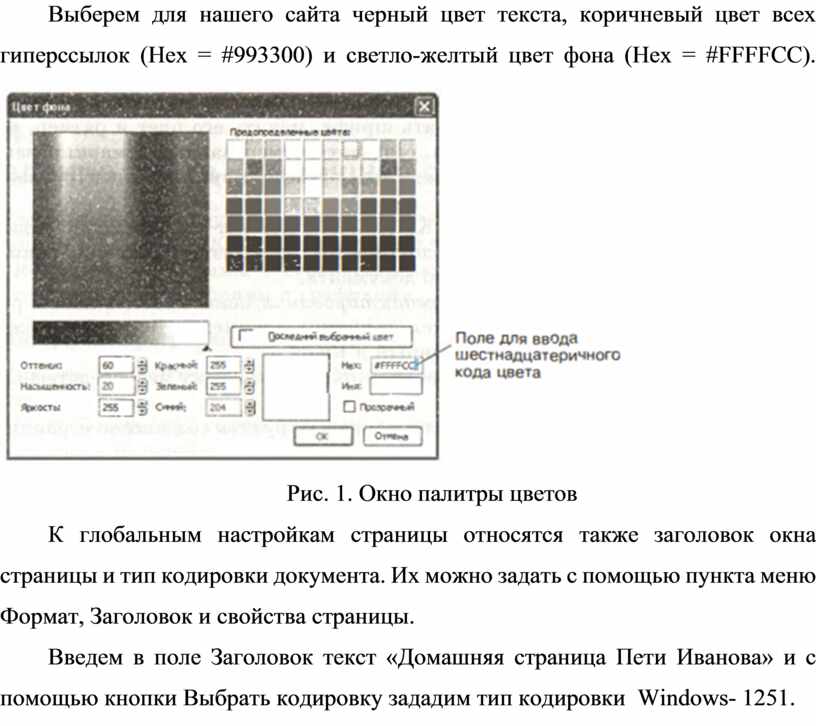 Введем в поле Заголовок текст «Домашняя страница Пети Иванова» и с помощью кнопки Выбрать кодировку зададим тип кодировки Windows- 1251.