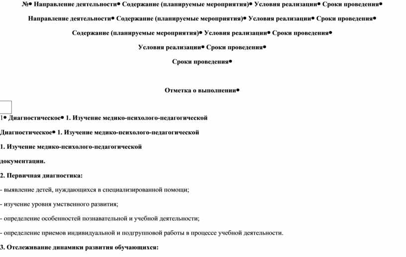 1. Изучение медико-психолого-педагогической документации. 2. Первичная диагностика: - выявление детей, нуждающихся в специализированной помощи; - изучение уровня умственного развития; - определение особенностей познавательной и учебной деятельности; - определение приемов индивидуальной и подгрупповой работы в процессе учебной деятельности. 3. Отслеживание динамики развития обучающихся: - осуществление планомерного наблюдения за развитием ребенка в условиях коррекционного обучения. 4. Этапная диагностика: - изучение усвоения программных знаний, умений и навыков (по основным предметам); - определение эффективности коррекционной работы; - корректировка коррекционных программ, приемов и методов работы. 5. Текущая диагностика: - составление рекомендаций для проведения коррекционных мероприятий в летний период; - анализ результатов коррекционной работы за год. |