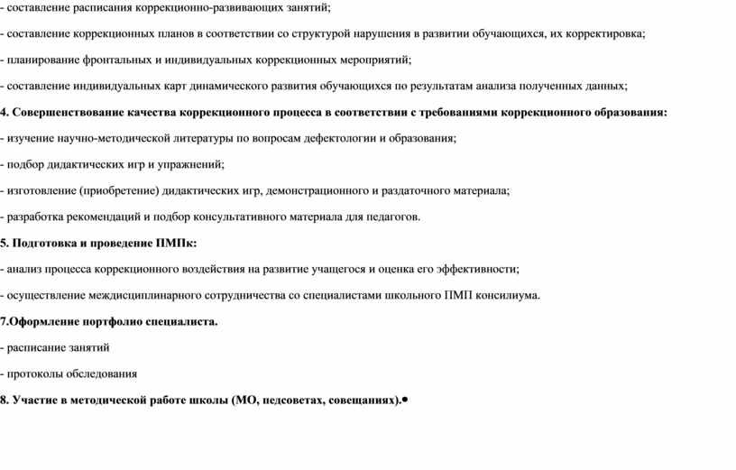 1.Оптимизация коррекционно-образовательного процесса. 2. Фиксирование результатов коррекционно-диагностической деятельности. 3. Оформление и ведение документации дефектолога: - составление расписания коррекционно-развивающих занятий; - составление коррекционных планов в соответствии со структурой нарушения в развитии обучающихся, их корректировка; - планирование фронтальных и индивидуальных коррекционных мероприятий; - составление индивидуальных карт динамического развития обучающихся по результатам анализа полученных данных; 4. Совершенствование качества коррекционного процесса в соответствии с требованиями коррекционного образования: - изучение научно-методической литературы по вопросам дефектологии и образования; - подбор дидактических игр и упражнений; - изготовление (приобретение) дидактических игр, демонстрационного и раздаточного материала; - разработка рекомендаций и подбор консультативного материала для педагогов. 5. Подготовка и проведение ПМПк: - анализ процесса коррекционного воздействия на развитие учащегося и оценка его эффективности; - осуществление междисциплинарного сотрудничества со специалистами школьного ПМП консилиума. 7.Оформление портфолио специалиста. - расписание занятий - протоколы обследования 8. Участие в методической работе школы (МО, педсоветах, совещаниях). |