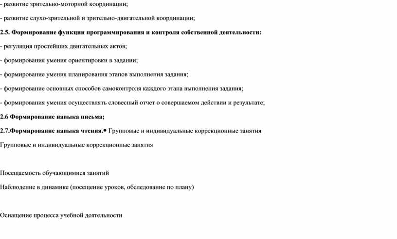 - Проведение индивидуальных и групповых коррекционных занятий, обеспечивающих усвоение программного материала и осуществление переноса сформированных на занятиях умений и навыков в учебную деятельность обучающихся;