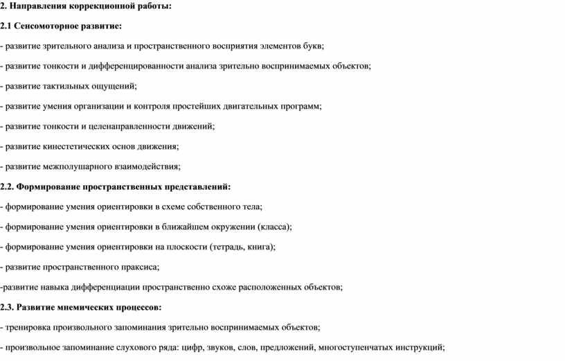 1. Коррекция имеющихся недостатков развития учебно-познавательной деятельности учащихся в форме групповых и индивидуальных занятий. 2. Направления коррекционной работы: 2.1 Сенсомоторное развитие: - развитие зрительного анализа и пространственного восприятия элементов букв; - развитие тонкости и дифференцированности анализа зрительно воспринимаемых объектов; - развитие тактильных ощущений; - развитие умения организации и контроля простейших двигательных программ; - развитие тонкости и целенаправленности движений; - развитие кинестетических основ движения; - развитие межполушарного взаимодействия; 2.2. Формирование пространственных представлений: - формирование умения ориентировки в схеме собственного тела; - формирование умения ориентировки в ближайшем окружении (класса); - формирование умения ориентировки на плоскости (тетрадь, книга); - развитие пространственного праксиса; -развитие навыка дифференциации пространственно схоже расположенных объектов; 2.3. Развитие мнемических процессов: - тренировка произвольного запоминания зрительно воспринимаемых объектов; - произвольное запоминание слухового ряда: цифр, звуков, слов, предложений, многоступенчатых инструкций; - развитие тактильной и кинестетической памяти; 2.4. Развитие межанализаторных систем, их взаимодействия: - развитие слухо-моторной координации; - развитие зрительно-моторной координации; - развитие слухо-зрительной и зрительно-двигательной координации; 2.5. Формирование функции программирования и контроля собственной деятельности: - регуляция простейших двигательных актов; - формирования умения ориентировки в задании; - формирование умения планирования этапов выполнения задания; - формирование основных способов самоконтроля каждого этапа выполнения задания; - формирования умения осуществлять словесный отчет о совершаемом действии и результате; 2.6 Формирование навыка письма; 2.7.Формирование навыка чтения. |