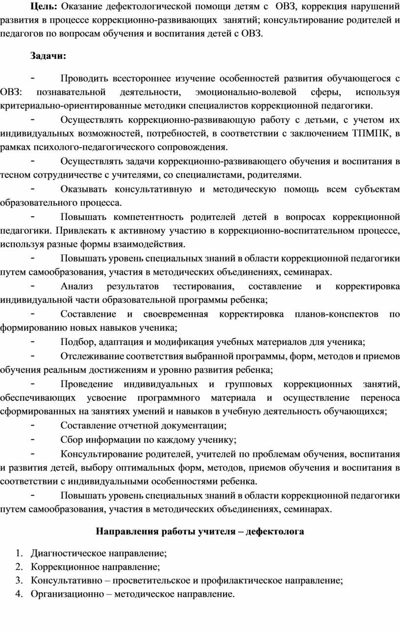 Цель: Оказание дефектологической помощи детям с ОВЗ, коррекция нарушений развития в процессе коррекционно-развивающих занятий; консультирование родителей и педагогов по вопросам обучения и воспитания детей с ОВЗ.