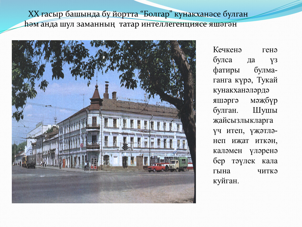 XX гасыр башында бу йортта “Болгар” кунакханәсе булган һәм анда шул заманның татар интеллегенциясе яшәгән