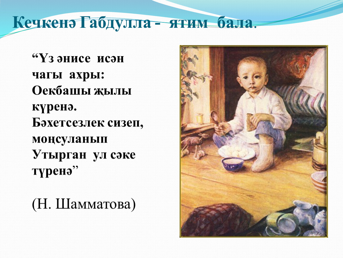 “Үз әнисе исән чагы ахры: Оекбашы җылы күренә. Бәхетсезлек сизеп, моңсуланып Утырган ул сәке түренә”