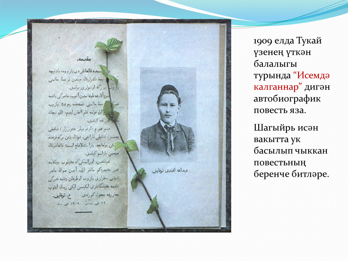 1909 елда Тукай үзенең үткән балалыгы турында “Исемдә калганнар” дигән автобиографик повесть яза.