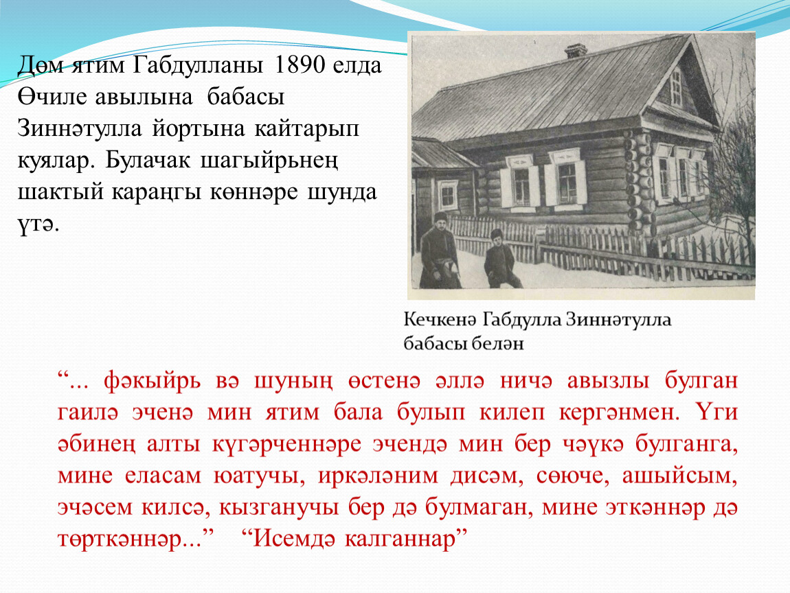“... фәкыйрь вә шуның өстенә әллә ничә авызлы булган гаилә эченә мин ятим бала булып килеп кергәнмен. Үги әбинең алты күгәрченнәре эчендә мин бер чәүкә булганга, мине еласам юатучы, иркәләним дисәм, сөюче, ашыйсым, эчәсем килсә, кызганучы бер дә булмаган, мине эткәннәр дә төрткәннәр...” “Исемдә калганнар”