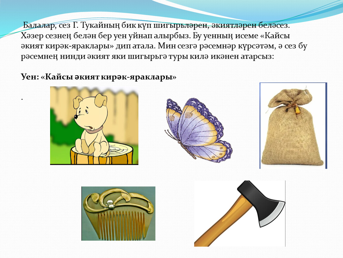 Балалар, сез Г. Тукайныӊ бик күп шигырьләрен, әкиятләрен беләсез. Хәзер сезнеӊ белән бер уен уйнап алырбыз. Бу уенныӊ исеме «Кайсы әкият кирәк-яраклары» дип атала. Мин сезгә рәсемнәр күрсәтәм, ә сез бу рәсемнеӊ нинди әкият яки шигырьгә туры килә икәнен атарсыз: